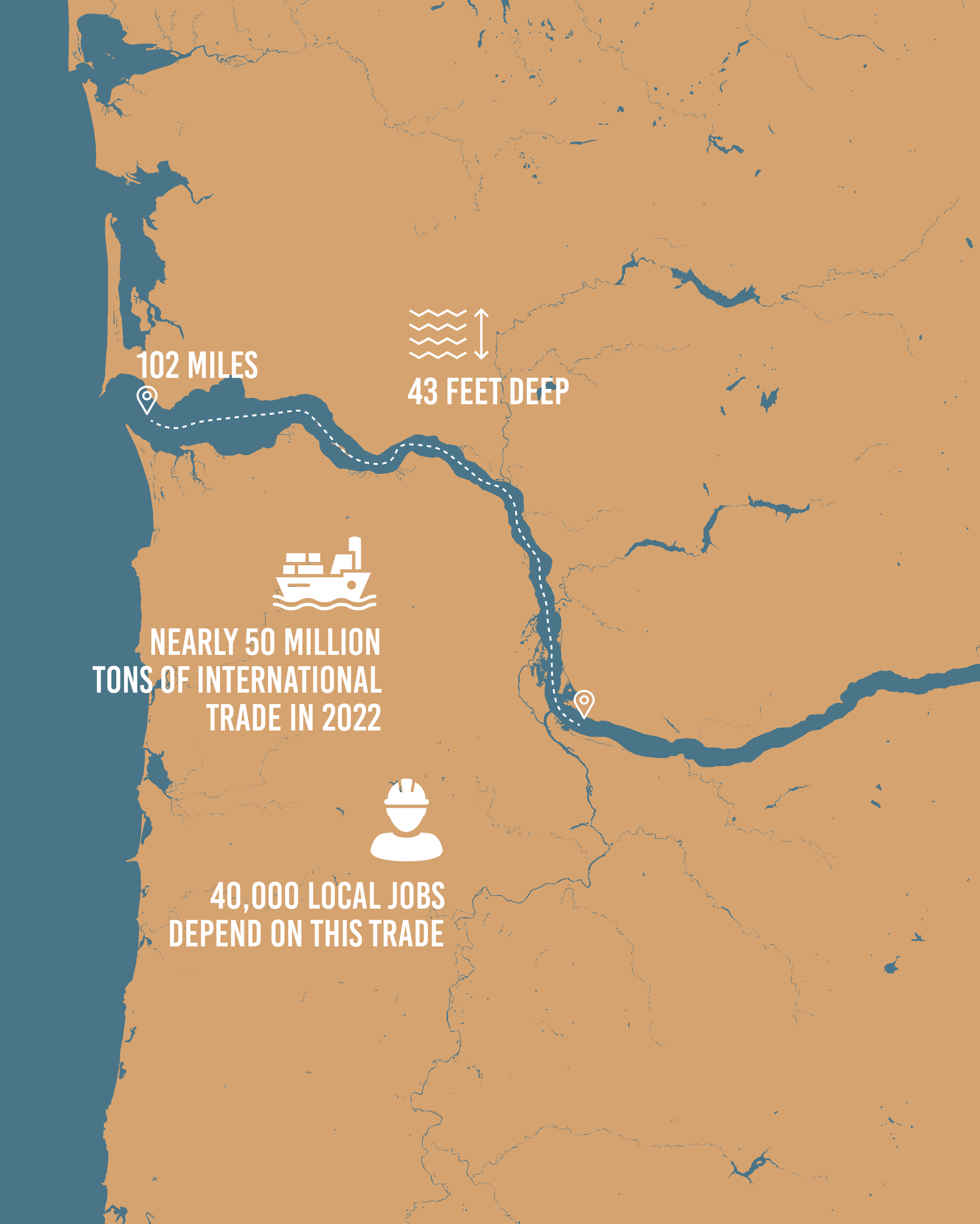 The Lower Columbia River – the 102-mile-long section from Vancouver, Washington, to Astoria – is a critical connection for international commerce. Here the river features a 43-foot-deep, federally maintained shipping channel. The channel allows the river and the region to accommodate oceangoing vessels carrying grain, fertilizer, logs, automobiles, wind energy components, and other products from source to market. This activity supports more than 40,000 jobs in our communities.